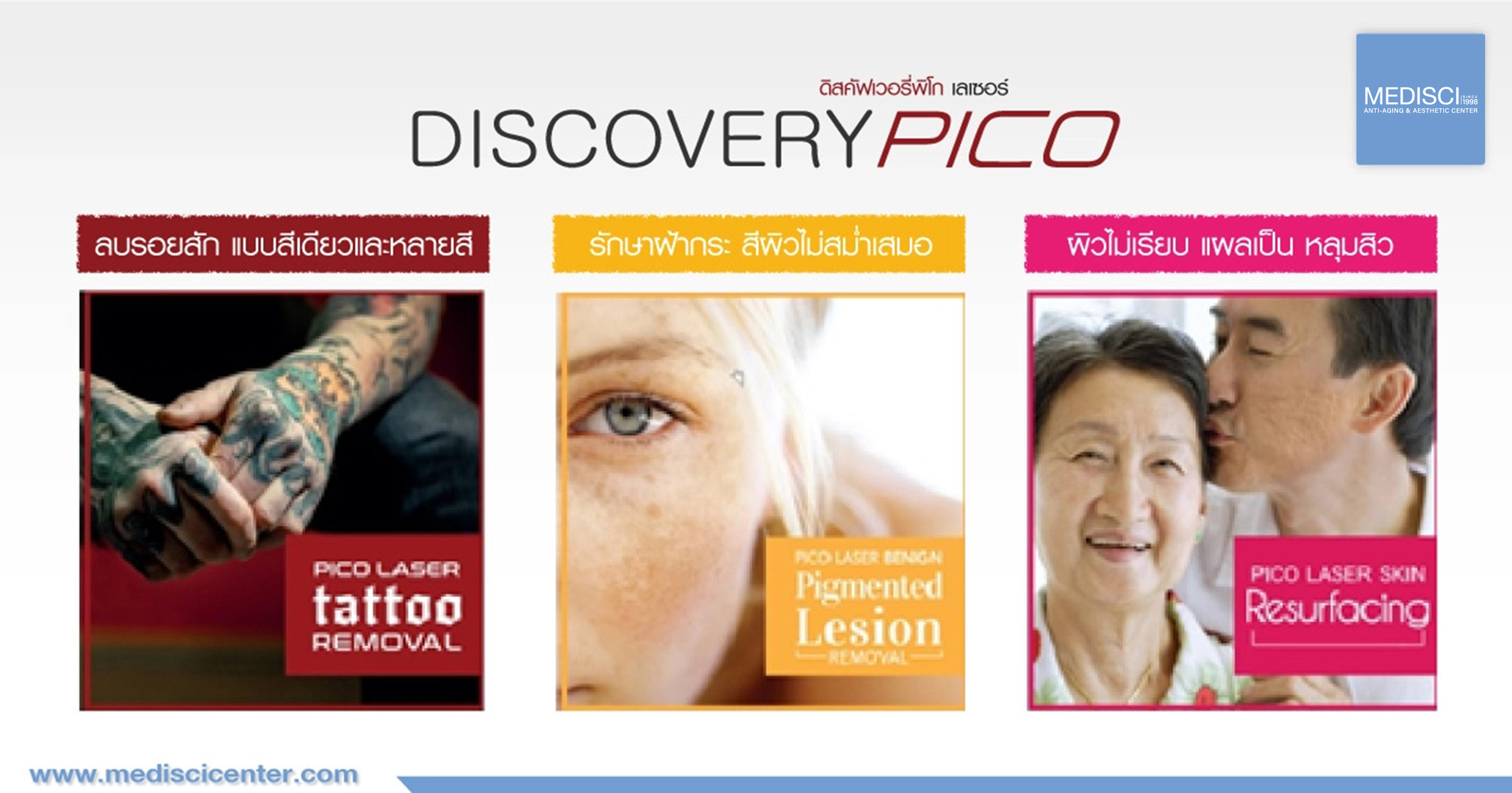 Discovery Pico laser คือ พิโค เลเซอร์ (Discovery Pico Laser) คือ เครื่องมือเลเซอร์ทางการแพทย์จากประเทศอิตาลีที่มีความโดดเด่นในการรักษาปัญหาทุกโครงสร้างผิว หลุมสิว แตกลาย แผลเป็น ปัญหาสีผิว กระ ฝ้า รอยดำ รวมถึงผู้ที่ต้องการลบรอยสักทุกสีในครั้งเดียวกัน โดยตัวเครื่องสามารถปล่อยคลื่นที่ทรงพลังมากสุดถึง 800 มิลลิจูล (mJ) ลงไปใต้ผิวและรวดเร็วโดยในหนึ่งลำแสงสามารถปล่อยพลังงานได้ภายใน 0.000000000001 หรือ 10-12 วินาที หรือเรียกว่าพิโคเซกเคินด์ (Picosecond) สามารถยิงลดเม็ดสีบนผิวหนังที่เข้มให้ลดลง หรือส่งพลังงานลงไปให้ปรับผิวใหม่ภายในระยะเวลาที่รวดเร็วพิโคเซกเคินด์ โดยเครื่องดิสคัฟเวอรีพิโค เลเซอร์ (Discovery pico laser) สามารถปล่อยคลื่นได้แบบดูเอิลเวฟเลงท์ (Dual wavelength) แพทย์สามารถเลือกใช้ความยาวคลื่นได้ทั้ง 532 นาโนเมตร และ 1064 นาโนเมตร ควบคู่กับการเทคนิคที่เป็นเอกลักษณ์เฉพาะของทีมแพทย์เมดดิไซน์